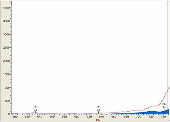 下图实谱表示纯铜rc101(Pb,0ppm)即本底、红色虚谱为 镍白铜313(Pb:60ppm)