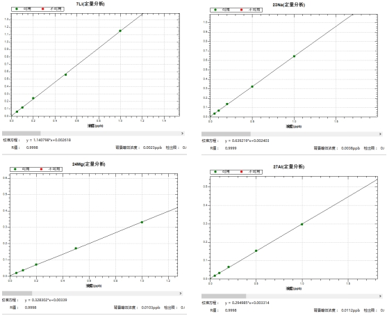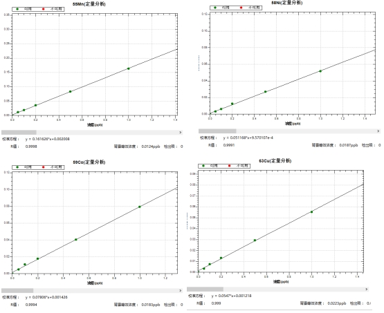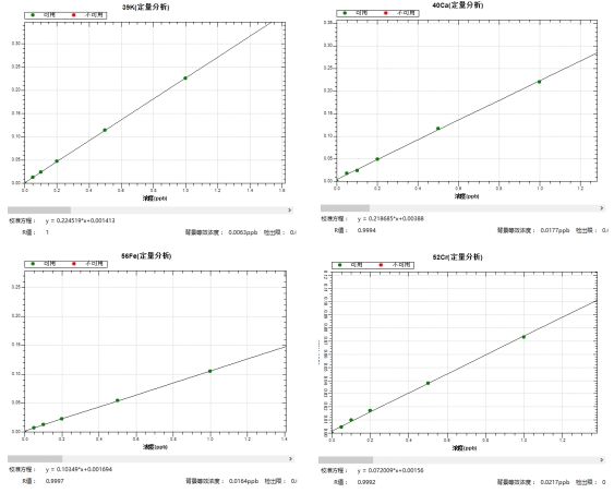 冷焰模式下,绘制各元素0,0.05,0.1,0.2,0.5,1.0μg/L系列浓度标液工作曲线,39K、40Ca、56Fe等同位素的线性相关系数r均大于0.999,背景等效浓度为0.0023μg/L~0.0217μg/L。