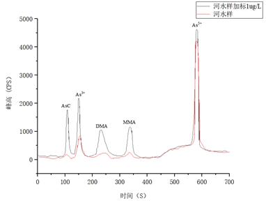 河水样品及加标1µg/L的测试结果详见表4,样品及加标后砷形态叠加谱图如图5所示。