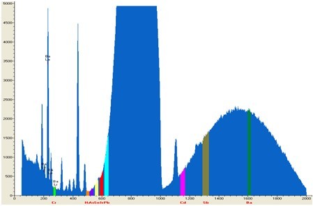 使用EDX 9000C仪器对汽车配件玻璃样品进行测试,测试时间1秒,其测试谱图和数据如下图: