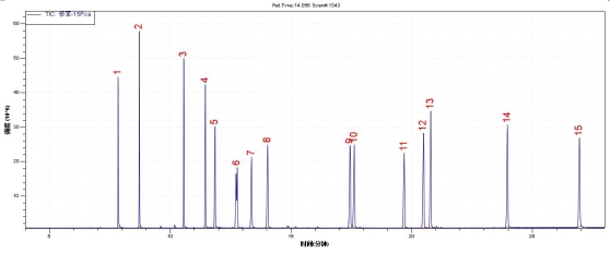 图1 . 15种邻苯二甲酸酯标准品TIC图