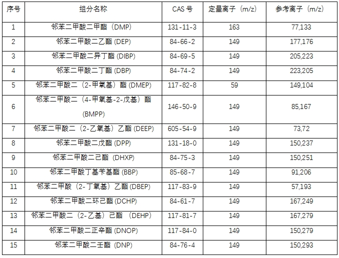 参照现行相关标准:GB 5009.271—2016《食品安全国家标准 食品中邻苯二甲酸酯的测定》、GB 9685-2016《食品 安全国家标准 食品接触材料及制品用添加剂使用标准》、LS/T 6131-2018《粮油检验 植物油中邻苯二甲酸酯类化合物的测定》,本方法对食用油中的15种邻苯二甲酸酯类物质进行检测,样品经有机溶剂提取、净化、定容后,用GC-MS 6800气相色谱质谱联用仪进行准确的定性和定量测定。