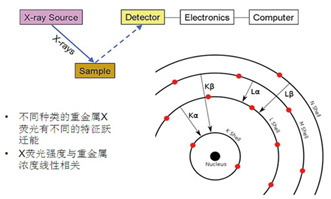 X射线荧光光谱技术(XRF)的原理见图3所示,可以直接检测固体或液体样品中ppm量级的元素成分。采用富集后再检测的办法,使得XRF技术对空气颗粒物中的重金属成分的检测限优于0.001ug/m3。而常规实验室的检测技术,由于预处理消解过程中需要将微克量级的样品溶解到几十克的液体中,而使得浓度被稀释百万倍,从而多数仪器(譬如ICP-AES、或原子吸收光谱仪)无法检出元素含量低于10ug/m3量级的空气颗粒物样品。