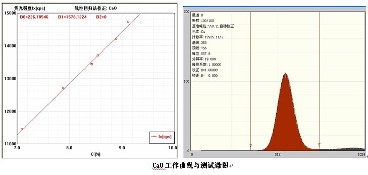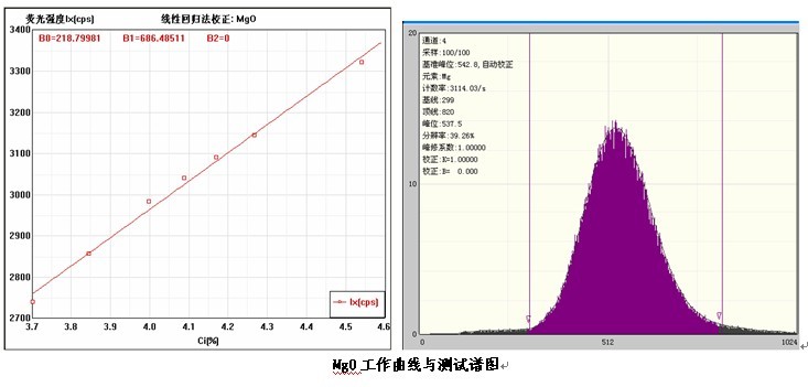 各个元素的工作曲线与测试谱图,其中B0为曲线节距;B1:为曲线斜率;在测试谱图中有元素的测试信息:计数率,采样时间,分辨率等。
