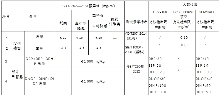 表 5. 溶剂残留、邻苯二甲酸酯类物质限量及检测一览表