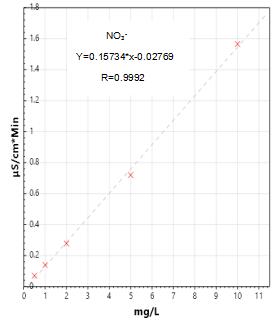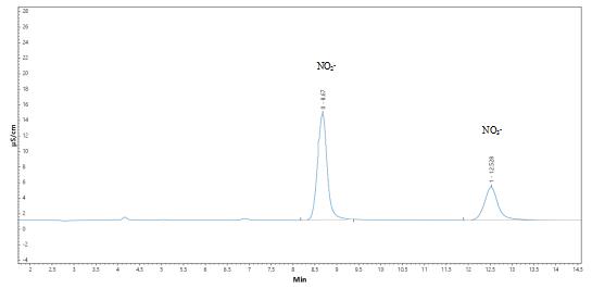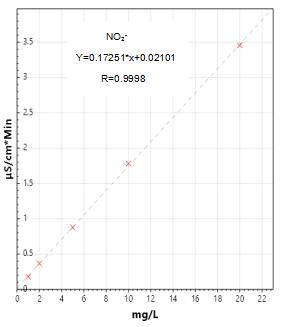 4.亚硝酸盐及硝酸盐测试曲线谱图详见图3-1、3-2,标准样品谱图及实际样品加标测试的谱图见图4-1、4-2。