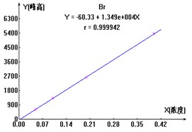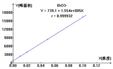 移取一定量的溴酸盐标液(1000μg/ml),配置成浓度为10μg/ml的溴酸盐储备液,再分别移取0ml、0.1ml、0.2ml、0.5ml、1.0ml的10μg/ml的溴酸盐储备液至100ml玻璃容量瓶,并加超纯水定容,配制成0μg/l、10μg/l、20μg/l、50μg/l、100μg/l的系列标准溶液,如下图3 为BrO3-离子标准曲线图。
