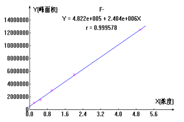 依次用移液枪移取氟离子标准溶液(1000mg/L)0.02mL、0.05mL、0.1mL、0.2mL、0.5mL分别于5个100mL的容量瓶中,用超纯水定容至刻度并摇匀,各标准曲线的浓度详见表1,氟离子的曲线方程及线性如图2所示。