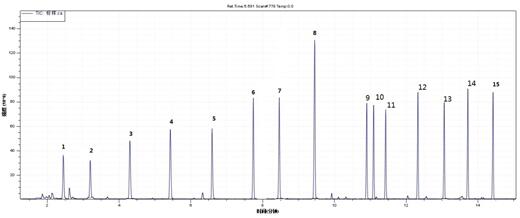 1.正己烷 2. 3.三氯乙烯 4.甲苯 5.辛烯 6.乙酸丁酯 7.乙苯 8.对(间)二甲苯 9.邻二甲苯 10.苯乙烯 11.壬烷 12.异辛醇 13.十一烷 14.十四烷 15.十六烷