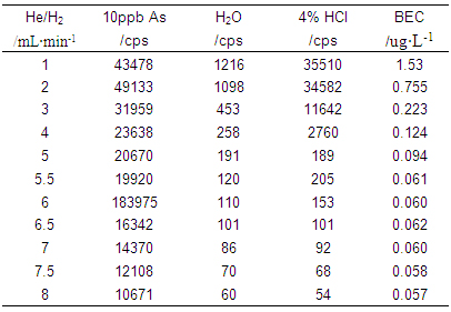仪器首先在标准模式下进行参数优化(利用10μg·L-1的Li、Co、In、U、Ce调谐液对仪器工作参数进行调节,使仪器灵敏度高,同时氧化物及双电荷产率小于3%);再开启He/H2碰撞反应气,逐步增大He/H2流量,测试超纯水、4%HCl及10μg·L-1 As(4%HCl介质)在75amu处的响应信号,计算其背景等效浓度(详细数据见表1及图1);并利用As标液进一步优化He/H2流量,得到仪器工作参数如表2所示。