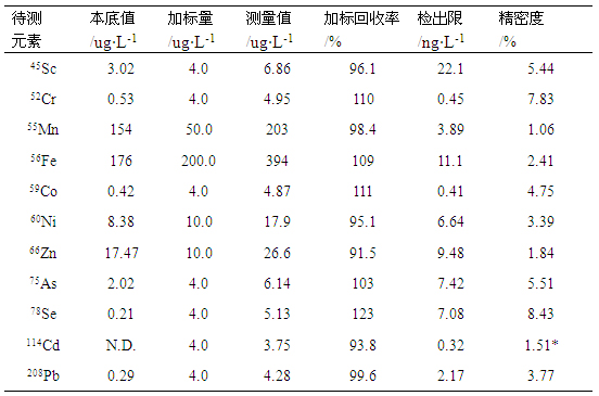 在仪器优化工作参数条件下,对样品溶液及加标样液进行测试,计算其加标回收率;对样品空白溶液平行测定7次,以三倍空白信号标准偏差/灵敏度对应的浓度为检出限;同时对样品溶液平行测定11次(间隔2min),计算其相对标准偏差,考察精密度,数据见表4。各元素检出限在0.41-22.07ng/L之间,加标回收率在93.82%-123.10%之间,精密度在1.06%-8.43%之间。